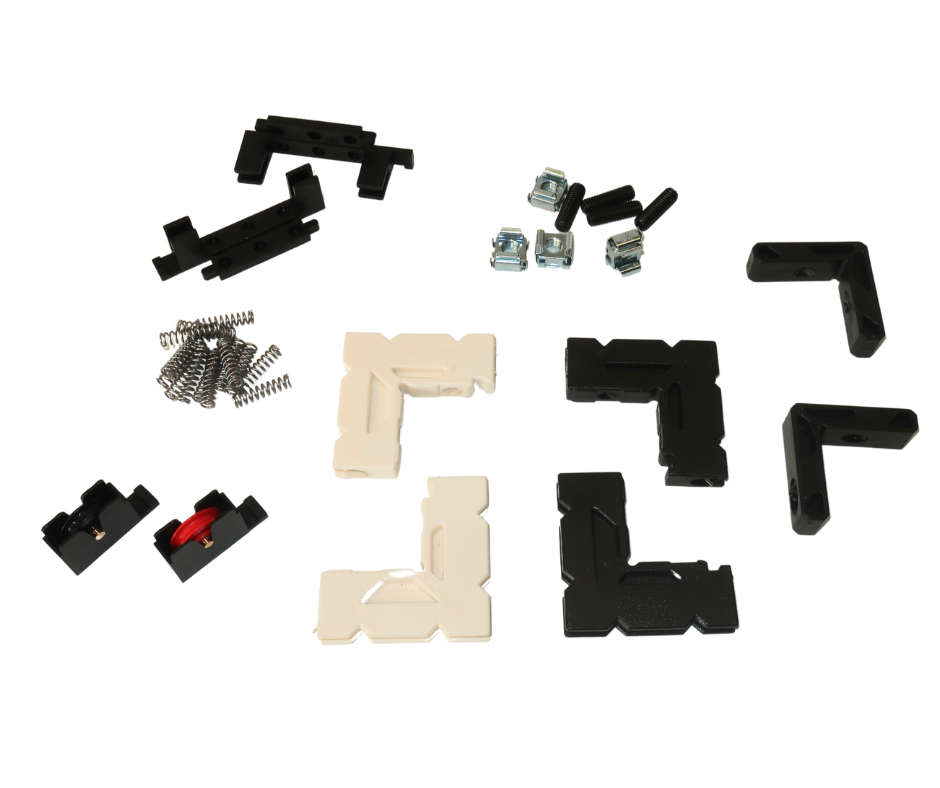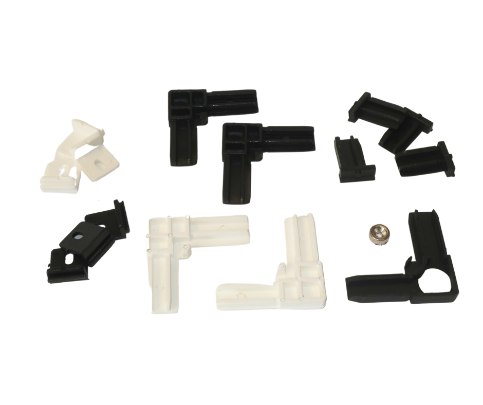 Linea completa di accessori quali squadrette angolari di vario tipo, per traverso, per fissaggio e tutto il necessario per la realizzazione di zanzariere a pannello fisso.