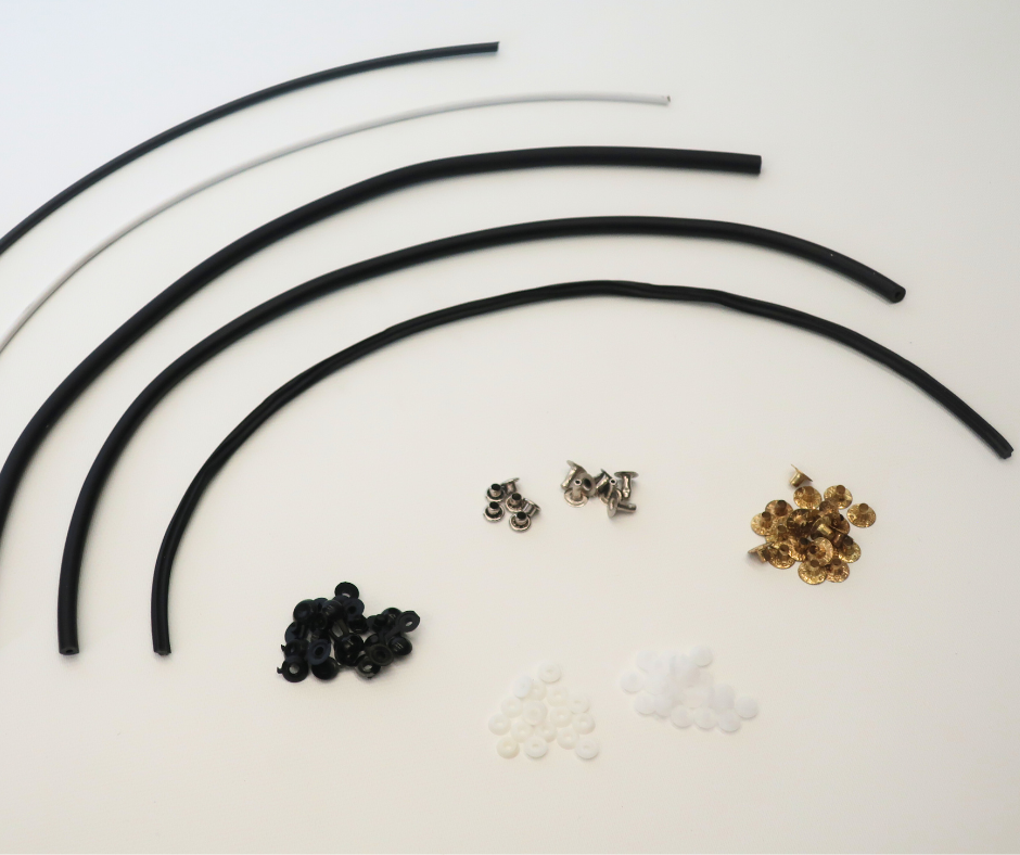 Accessori vari quali bottoncini manuali, bottoncini per bottonatrice automatica, rivetti e vari tondini estrusi in PVC da utilizzare per la realizzazione di zanzariere di vario tipo.