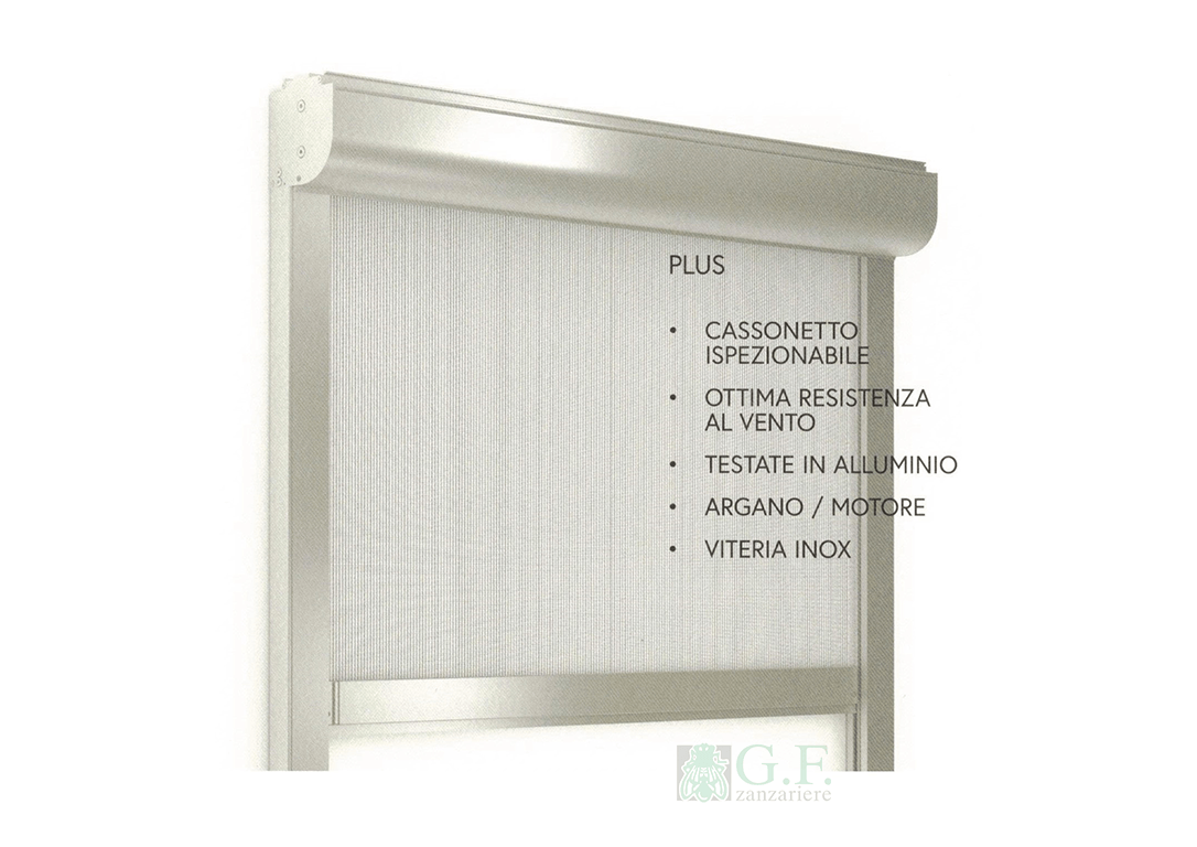 Zanzariera a scorrimento verticale con movimento di riavvolgimento del telo tramite molla in acciaio.