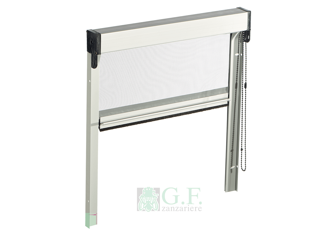Zanzariera a scorrimento verticale con movimento di riavvolgimento del telo tramite molla in acciaio.